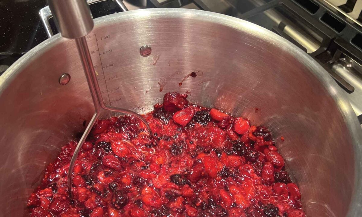 I took the lead in cooking up the mixture of crushed berries, grated apple, and lemon juice over high heat. My children stirred a few times, but the high heat made it difficult for them to stir continuously. I had my kids read the candy thermometer and spearhead the freezer test to see if the jam was the right consistency.