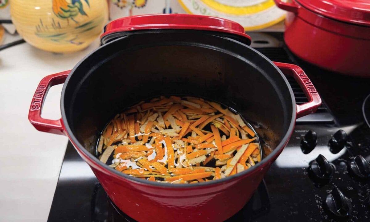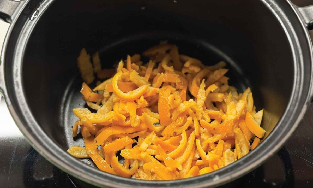 - Simmer covered for 30 minutes to blanch the peels. After 30 minutes, remove the lid. The liquid should be lightly amber in color and quite fragrant.